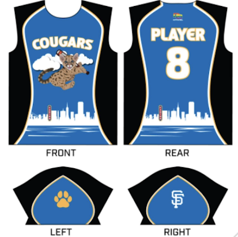 This Jersey for a local softball team has aspects of the city of San Francisco and the youthfulness of the players and the team name Cougars, along with their nickname CUBS. The 'Cub' used is playful and the background puffy clouds are the usual San Francisco treat of the weather.